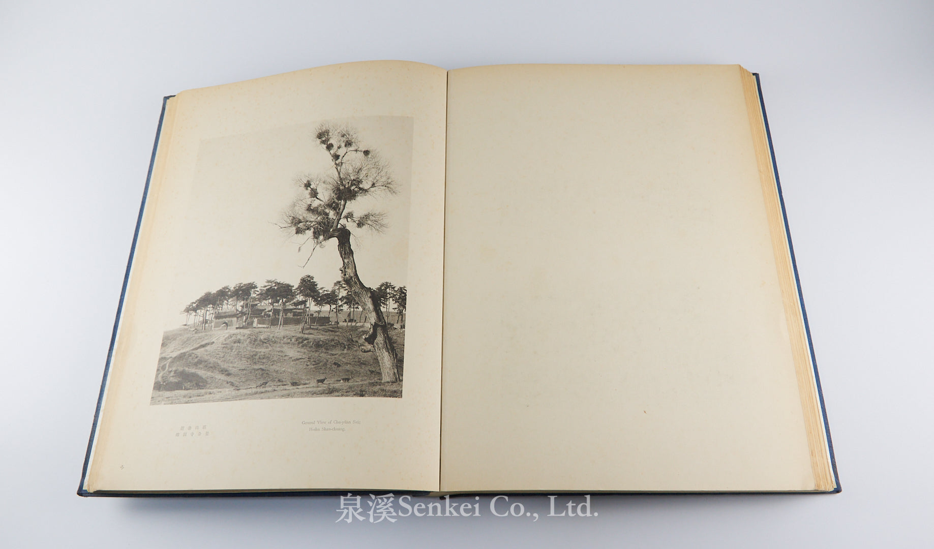 A monumental large-format bilingual photographic survey of the imperial and religious monuments of Jehol (Rehe/Chengde), issued in 1934 under the Manchukuo administration. The set comprises four imposing folio volumes (43.7 × 34.6 cm), Japanese-style bound in indigo hand-dyed cloth with gilt edges.